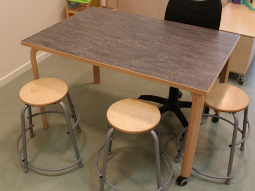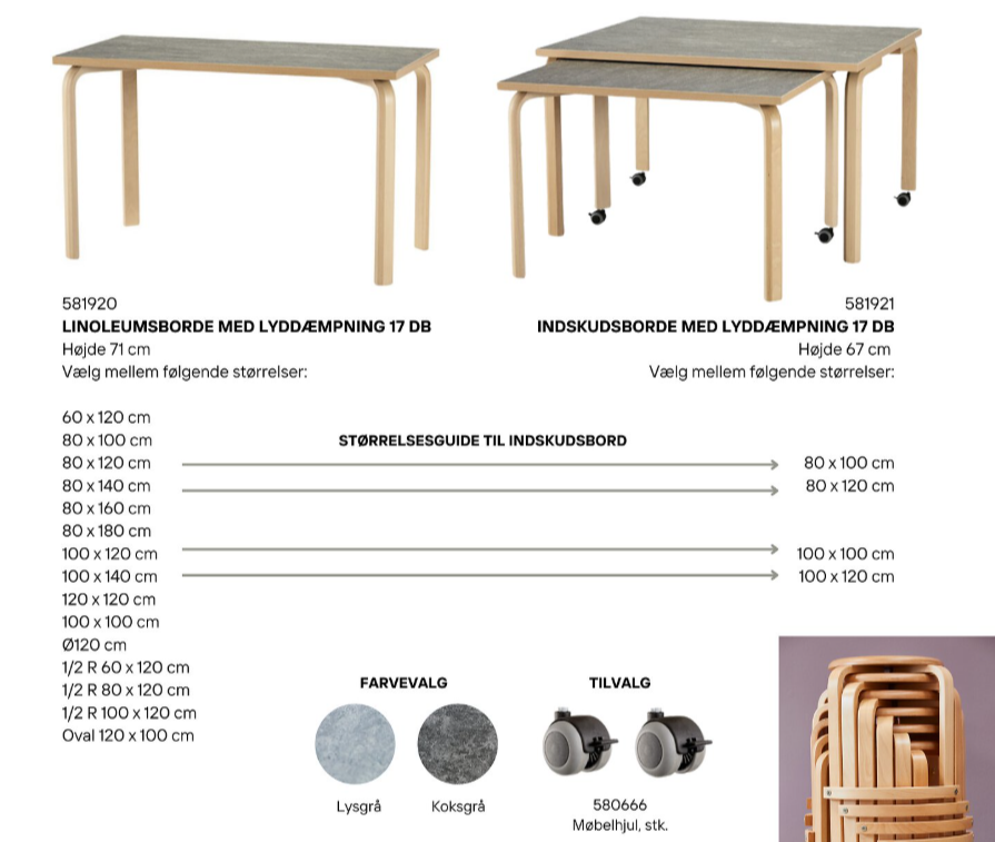Noget vi altid anbefaler, et lyddæmpende linoleum bord.. Vi ved, at støjniveauet i en institution - uanset hvilken type - kan være højt - at børnene kan sidde med elementer ved bordene der kan give høje lyde, både ved selve bordet men også ud i rummet.