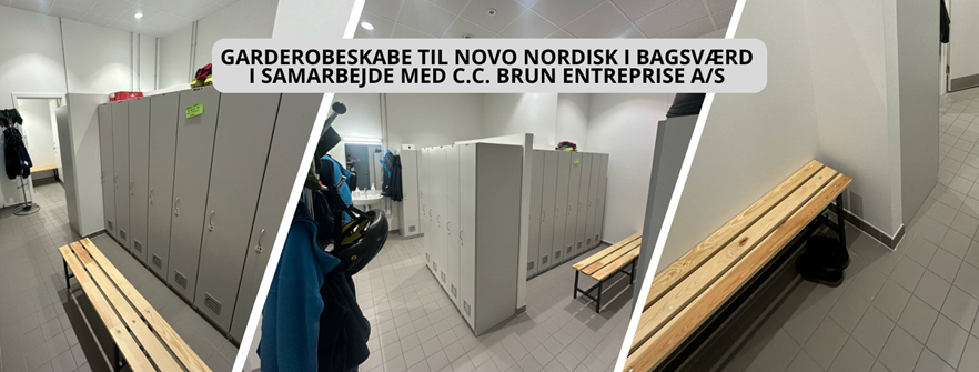 Garderobeskabe og bænke til omklædningsrum hos Novo Nordisk.