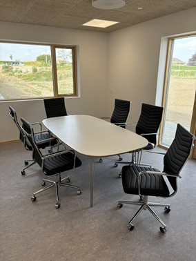 Mødebord samt tilhørende stole, hører et mødelokale til. Institutionen ønskede et mødebord med runde kanter, således der er plads til flere om bordet, uden dem siddende på hjørnepladserne, føler de støder benene i bordpladens hjørne. Mødebordet her er vores ovale, hvide bord med mulighed for udtræksplade. Bordet måler H73cm og 160 cm i længden.
