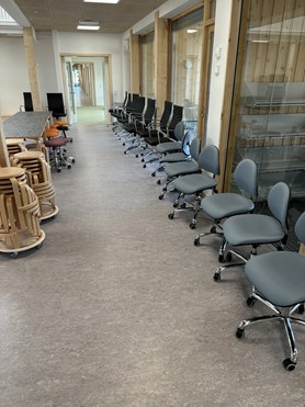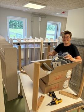 Alle vores arbejdsstole kommer som standard u-samlet for at sparre på transportomkostningerne. Som større projekter som dette, tilbyder vi vores kunder at samle stolene på stedet og tage alt emballage med retur. På billedet nedenfor ses Tina i fuld færd med at samle en alu taburet. I baggrunden på billedet nedenfor, ses også et lille udpluk af de børnegarderober, vi også har leveret. Garderoben er i hvidpigmenteret birkefiner med bænk, lys-grå laminat.