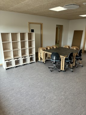 På alle stuer samt fællesrum står der lyddæmpende linoleumsborde i forskellige størrelser, således børn og voksne kan sidde ved bordet uden bekymring om larm fra bordpladen når i brug - det lyddæmpende linoleum dæmper nemlig lydniveauet med 17 decibel. Bordet på billedet ovenfor er i standardhøjde på H71 cm med møbelhjul, således bordet nemt kan flyttes.