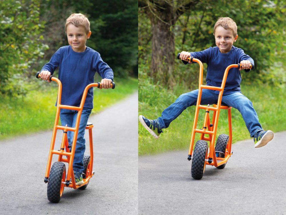 Denne smarte løbecykel kan bruges både stående og siddende, da den er udstyret med et lille komfortabelt sæde bagpå. Barnet der bruger cyklen, har hermed mulighed for at sætte sig ned undervejs.