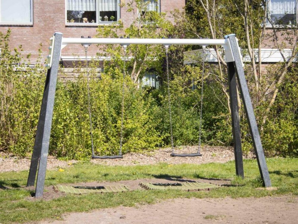 Et fint og enkelt gyngestativ med to sæder og med stolper i genbrugsplast. Stativet henvender sig til børn fra 4-12 år. Gyngestativet passer perfekt ind på campingpladsen, legepladsen i boligforeningen eller i børnehaven.