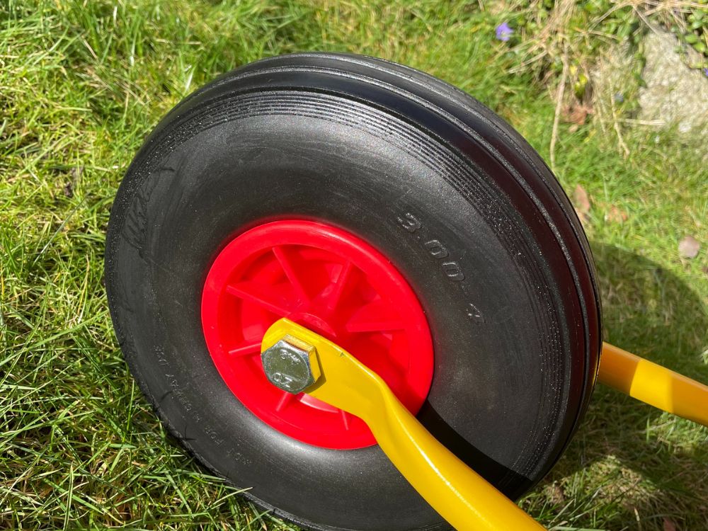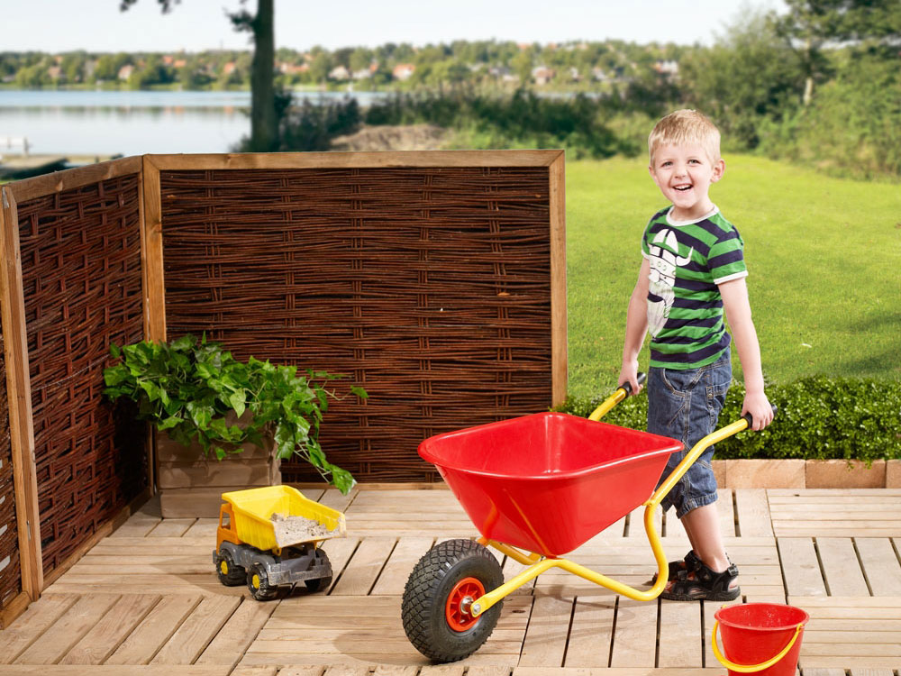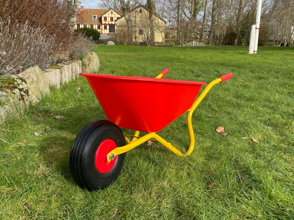 En fin, rød trillebør - perfekt til børnene. Kan bruges til de større børn, her særligt fra børn i børnehaven. Vi anbefaler ikke dette produkt til vuggestuebørn grundet størrelsen.