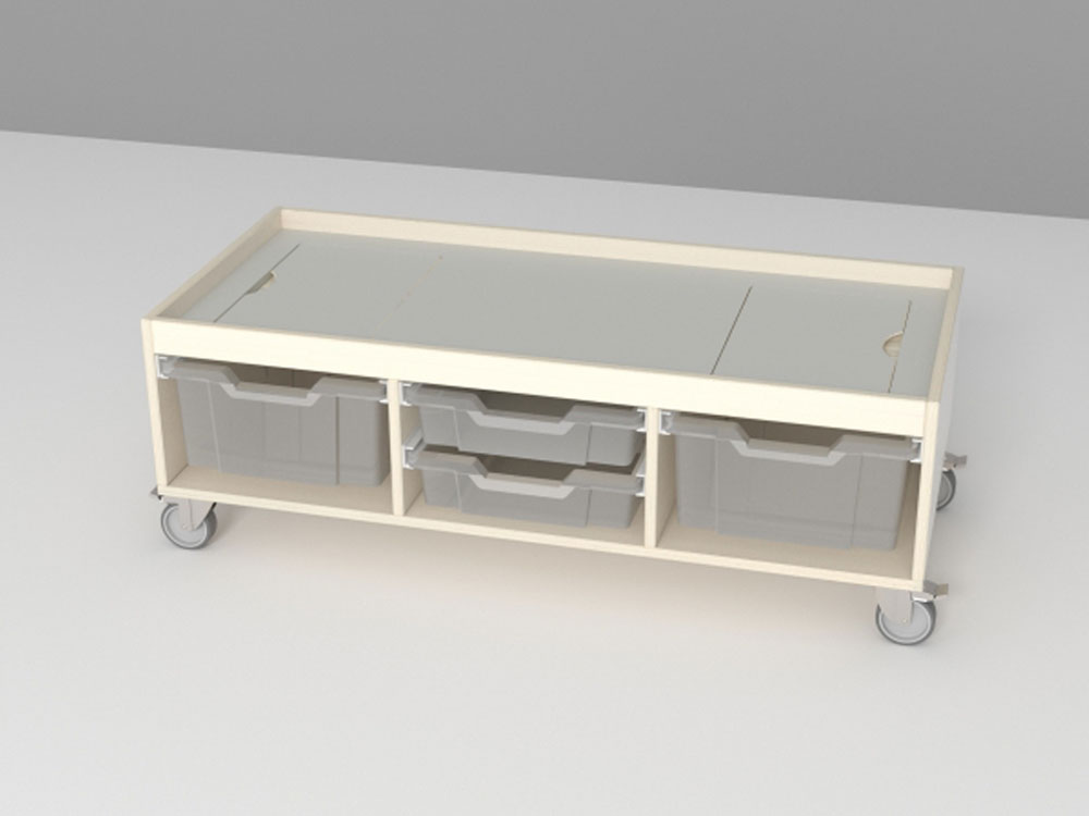 Mobilt og funktionelt legebord med plastkasser under bordplade for nem og hurtig opbevaring.