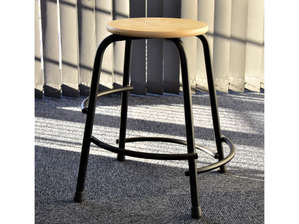 Stabil taburet med sort stel i aluminium med birk finér sæde. Taburetten måler Højde 49,5 cm, Sæde Ø29 cm / 18 mm.